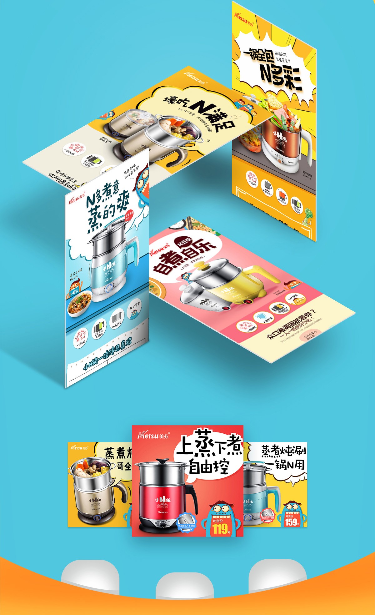 针对产品功能属性与核心消费利益,一次次的头脑风暴后,我们重新赋予美苏电煮锅一个全新的姿态—“小N锅”“一锅N用,吃货劲满足”。3个人格化的顽皮卡通吃货形象,背负着美苏产品形象大使的重任。从小N锅概念/核心价值提炼/形象人物塑造/创意开箱体验等,完美呈现了“一锅N用 吃货劲满足”的特性,让更多的吃货吃得够壕够满足。